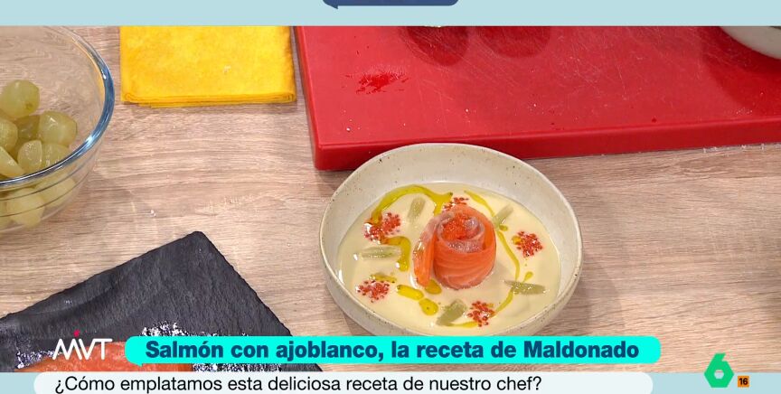 El chef Carlos Maldonado vuelve a Más Vale Tarde con una deliciosa propuesta, perfecta para Semana Santa: salmón marinado y ahumado con ajo blanco de uvas y caviar de salmón con aceite de coco. El cocinero destaca su punto fresco, "que acompaña al tiempo". Además, como indica Iñaki López, es un plato de vigilia debido a que no hay carne entre sus ingredientes.