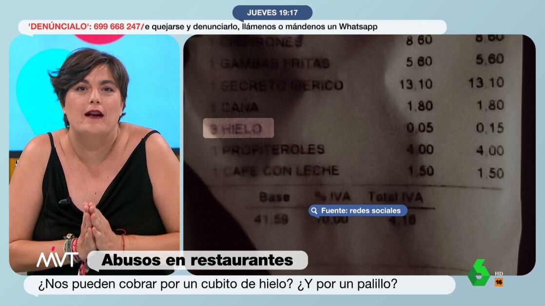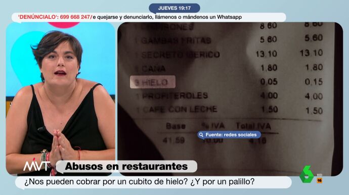 Por otra parte, la abogada Beatriz de Vicente recordó que "hay obligación legal de ofrecerle -al cliente- agua embotellada o del grifo, que no se puede cobrar". "Si a ustedes le cobran el agua del grifo, hojita de reclamaciones", ha recomendado la experta.