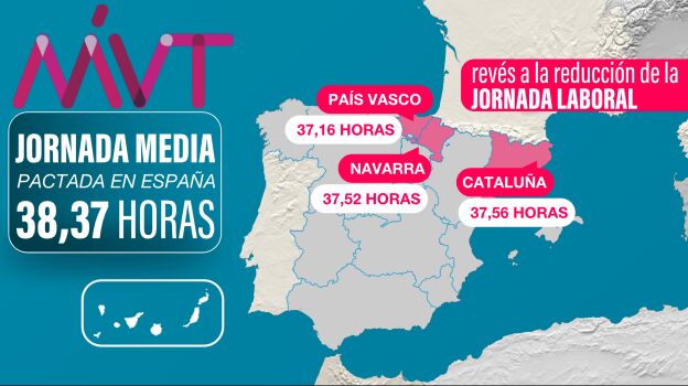 Lo cierto es que si vemos los datos, según los convenios colectivos, en España ya se trabaja de media 38,37 horas. Y entre las comunidades autónomas que tienen pactadas jornadas más reducidas está Cataluña. Está en el 'top 3' junto a Euskadi y Navarra con 37,56 horas. En este caso, la media de la jornada laboral en Euskadi es de 37,16 horas mientras en Navarra es de 37,52 horas.