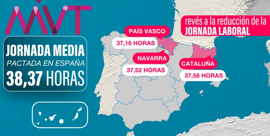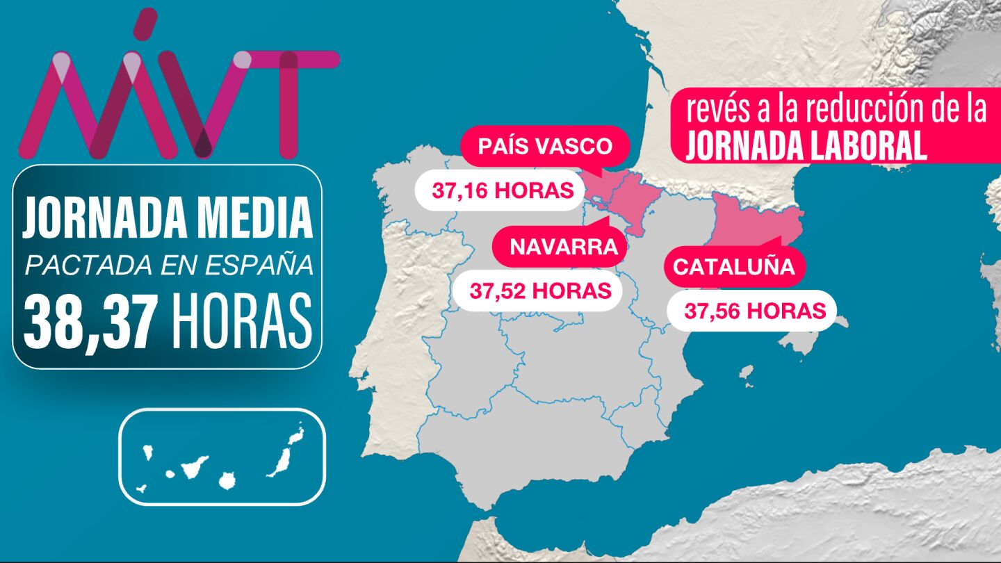 Los detalles Si vemos los datos, según los convenios colectivos, en España ya se trabaja de media 38,37 horas. Y entre las comunidades autónomas que tienen pactadas jornadas más reducidas está Cataluña, con 37,56 horas; Euskadi, con 37,16 horas y Navarra, con 37,52 horas.