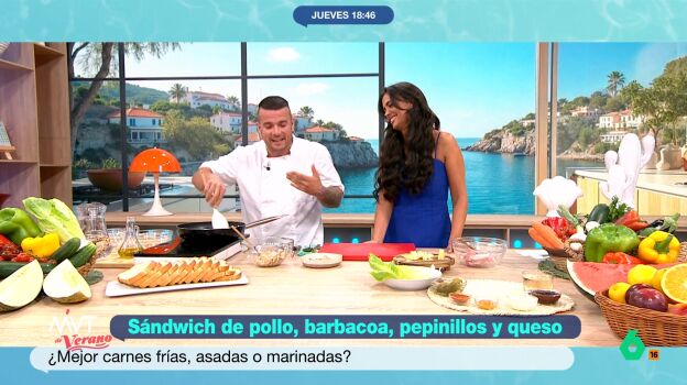 María Lamela pregunta al cocinero cuál es la mejor técnica para desmenuzar el pollo. Maldonado indica que, cuando la carne está fría, se puede hacer con dos tenedores para, de esta manera, se pueda deshebrar de manera sencilla.