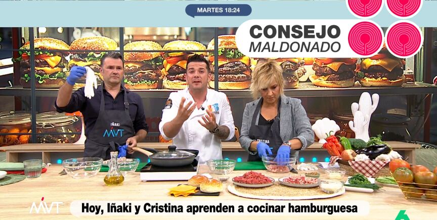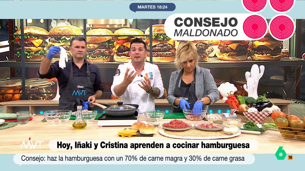 Como cada martes, el chef Carlos Maldonado pone a Iñaki López y Cristina Pardo a cocinar. En esta ocasión propone una receta de hamburguesa. El cocinero explica cómo preparar este plato para que la elaboración quede deliciosa.