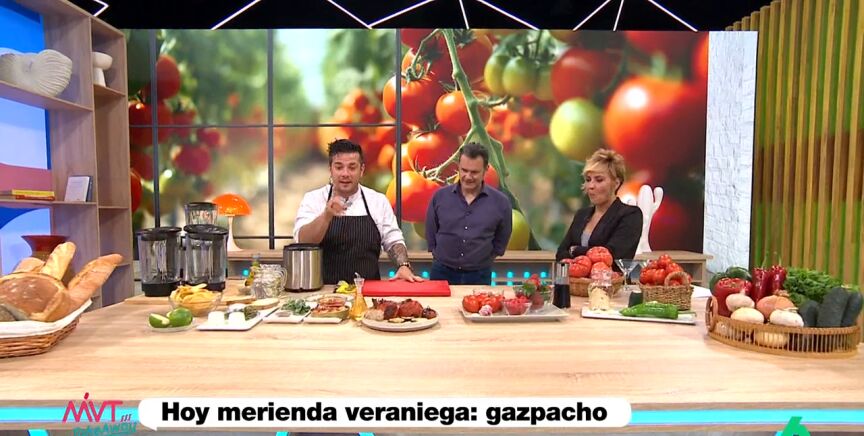 El chef con una estrella Michelín Carlos Maldonado vista el plató de Más Vale Tarde para presentar una innovadora que cualquier puede poner en práctica este verano. El primer paso de la receta de Maldonado es pasar los ingredientes del gazpacho por el horno y conservar todo el jugo que han dejado durante el asado.