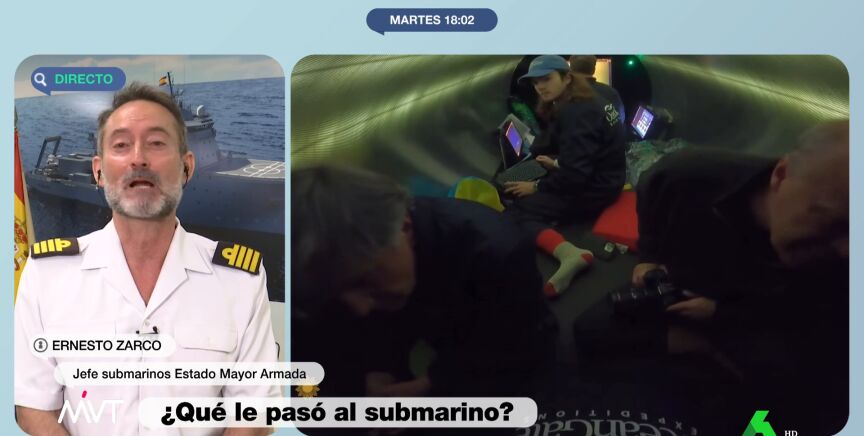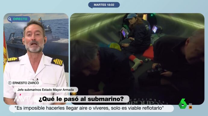 Ernesto Zarzo, jefe de submarinos del Estado Mayor de la Armada, asegura que hay posibilidad de que las cinco personas que están a bordo del submarino desaparecidosigan con vida. Así, el experto insiste en que el factor más importante es el CO2. "No estamos hablando solo de oxígeno. No es el factor mas importante. El factor más importante es el CO2, es la respiración y lo que expulsamos al exhalar. Ése CO2 es el que finalmente puede ocasionar la muerte", ha explicado en directo.