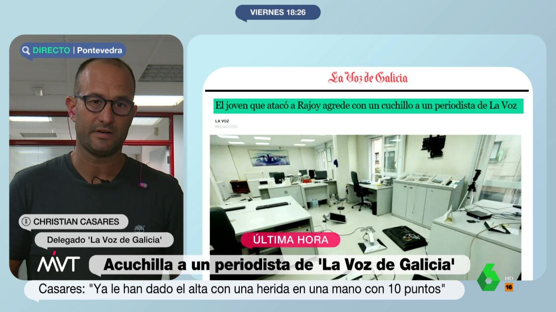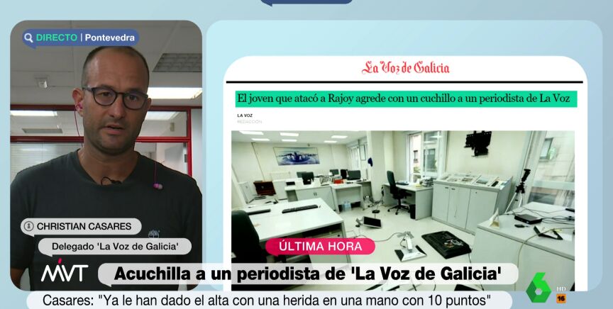 Christian Casares, delegado de 'La Voz de Galicia' en Pontevedra, ha explicado en Más Vale Tarde este viernes todos los detalles sobre la agresión a un compañero suyo por parte del hombre que atacó a Mariano Rajoy cuando era presidente. En la conexión con Casares, él ha desvelado que la familia del agresor se ha puesto en contacto con el periódico para "lamentar los hechos y pedir disculpas".