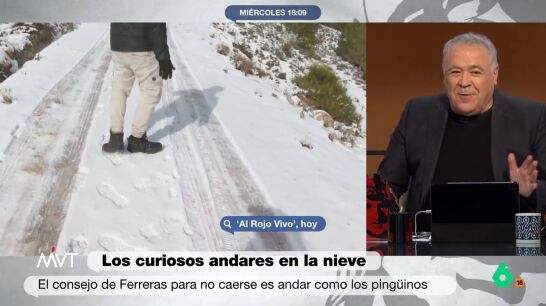 Esta mañana en 'Al rojo vivo' se vivía un divertido momento que recuerda Más Vale Tarde. En él, Antonio García Ferreras aconsejaba como "un leonés experto en Invernalia" a Javier Bastida, "un murciano que no es experto" sobre cómo hay que caminar en la nieve. "Con el hielo y la nieve, caminando siempre como un pingüino", le recomienda Ferreras, mientas el reportero le saca una sonrisa intentando imitar a este animal.