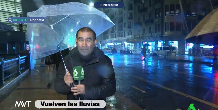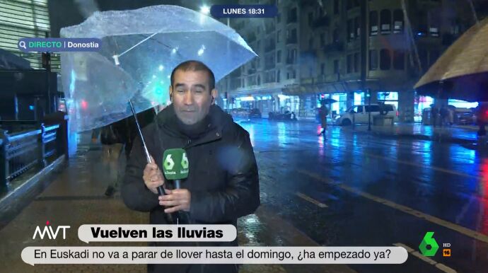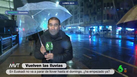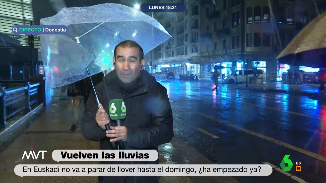 La previsión meteorológica para el País Vasco es de lluvias hasta por lo menos el domingo. Como muestra, Miguel Ángel Ambrosio explica cómo está la situación en San Sebastián, no sin algún que otro percance: "Perdón producción, tercer paraguas, no sé cómo va el ranking de paraguas destrozados", arranca la conexión el reportero de Más Vale Tarde.