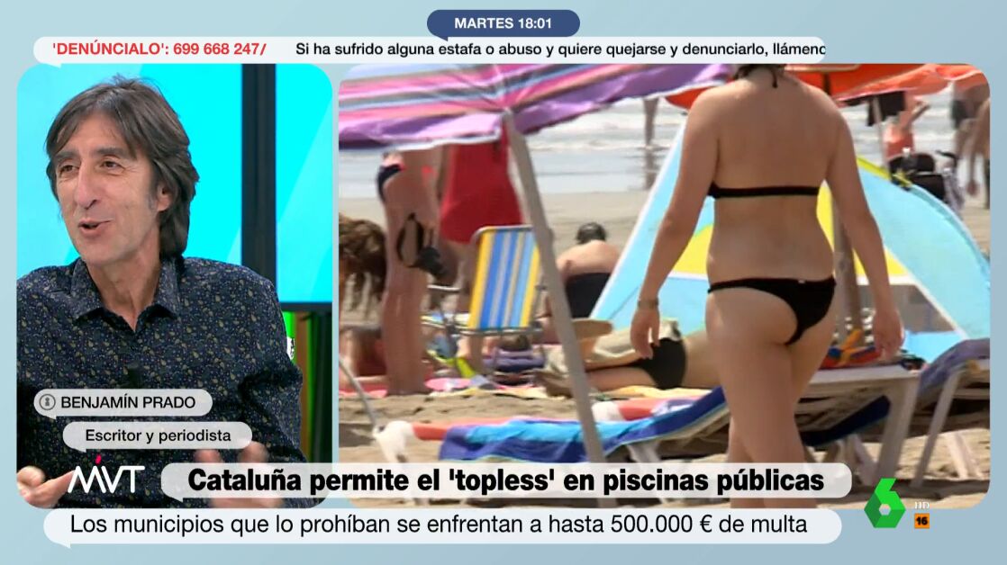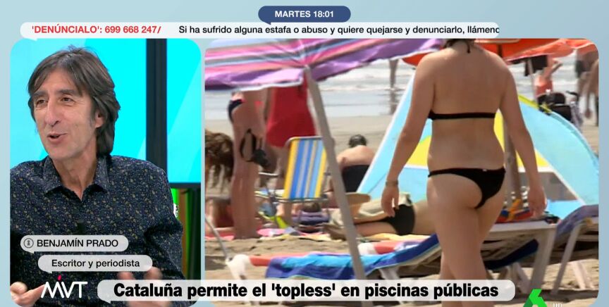 Benjamín Prado lanza una pregunta en directo. "¿Qué tiene la gente en la cabecica para que les dé tanto miedo ver unas tetas?", expresa el periodista. El también escritor cree que puede ser fruto del nuevo pensamiento ultra "que debe de querer decir que las tetas son para amamantar y para el marido cuando le apetezca por las noches", señala en relación a la carta que ha enviado la Generalitat a los ayuntamientos para recordarles que no pueden prohibir el topless en las piscinas municipales.