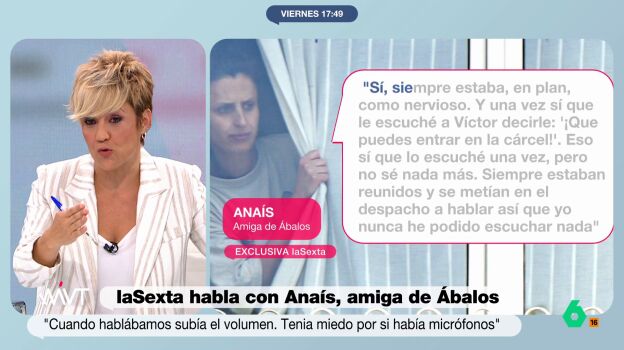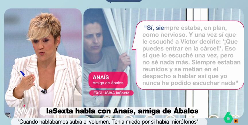 Este viernes, Anaís ha contado a laSexta que, desde que conoció a Ábalos en el mes de abril, sintió que "tenía miedo de entrar en la cárcel". Ha asegurado que estaba tan nervioso que le "hacía hablar en el coche subiendo el volumen a tope de su música y esconderme detrás de los asientos con un edredón". Todo, porque José Luis Ábalos llegó a obsesionarse con que hubiera micrófonos en su coche, en su vivienda y hasta en su despacho.