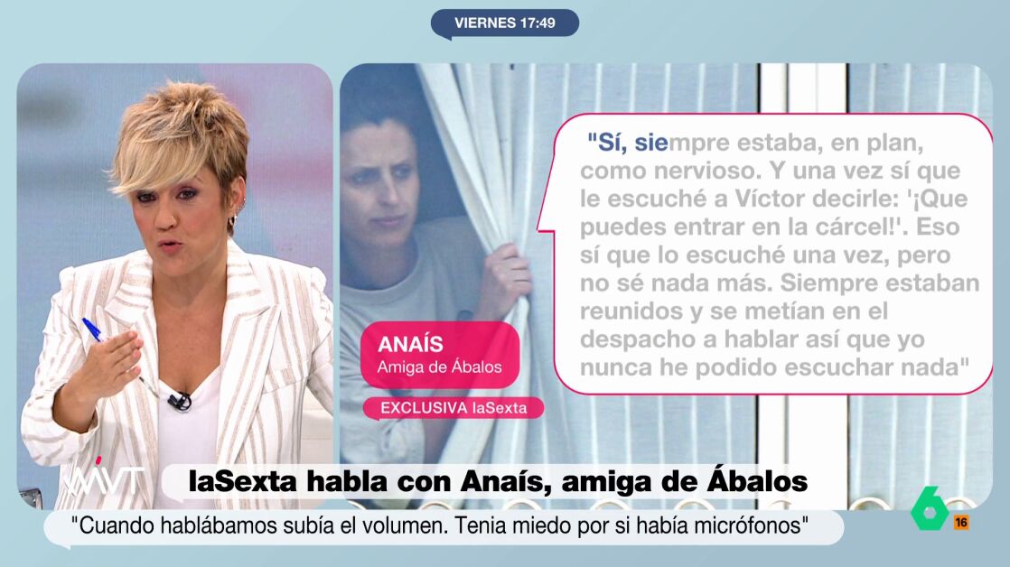 Según ha explicado la presentadora de MVT, ha sido la propia Anaís la que ha contado como el político tomaba muchas medidas de protección y seguridad que, al final, no han servido para mucho. "Debe ser un shock descubrir que tu asesor te ha grabado todo", ha explicado Pardo, entendiendo en cierto modo "la paranoia" de Ábalos "por saber si le estaba escuchado o no".