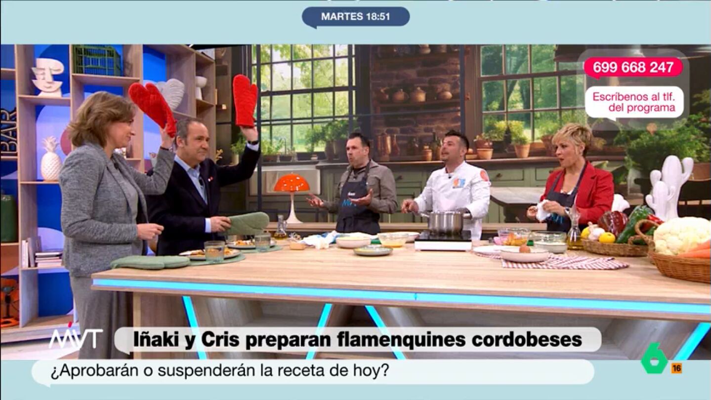 Iñaki López y Cristina Pardo se enfrentan a un nuevo reto culinario en Más Vale Tarde bajo la atenta mirada del chef Carlos Maldonado. En esta ocasión, intentan preparar flamenquines, pero solo uno de los dos logra el aprobado del jurado.