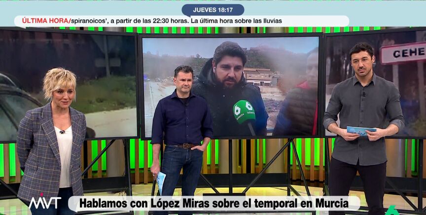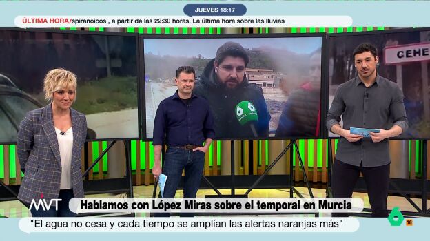 "Da la sensación de que ustedes han aprendido lo que no hay que hacer después de la riada del 29 de octubre en la Comunidad Valenciana", le comenta Cristina Pardo en el vídeo sobre estas líneas, donde recuerda que, igual que López Miras ahora, Juanma Moreno también visitó las zonas afectadas.