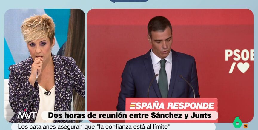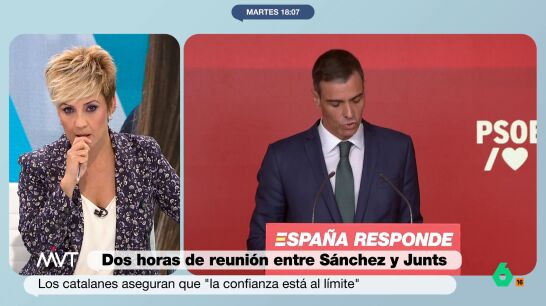 Desde el programa Más Vale Tarde, Cristina Pardo ha calificado el gesto de Junts como una "humillación" al presidente. "Es agudizar la humillación, el decir 'yo es que contigo ahora mismo no me hago ni una foto'. A mí me parece que es acentuar la humillación al presidente del Gobierno", ha opinado la periodista.