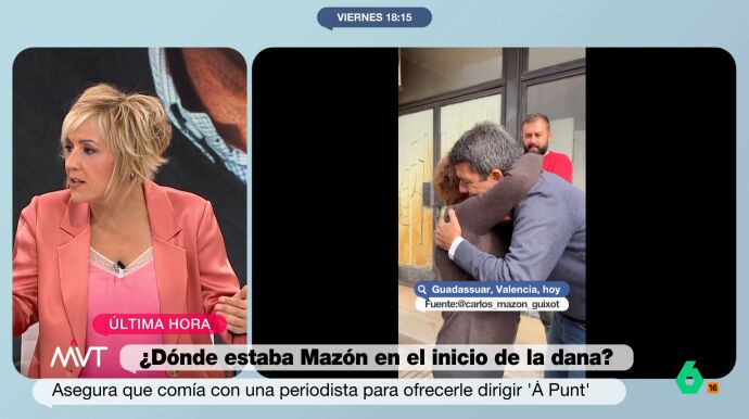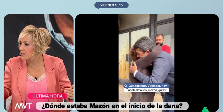 Carlos Mazón, presidente de la Generalitat Valenciana, ha publicado en sus redes sociales un vídeo en el que se le ve visitando Guadassuar, uno de los municipios afectados por la DANA. "Es uno de los que más ha avanzado en la recuperación de la normalidad", destaca Luis Sanabria en Más Vale Tarde. Sin embargo, ha llamado la atención que alterna imágenes nocturnas con diurnas. "Ha mezclado vídeos", observa uno de los colaboradores del programa.