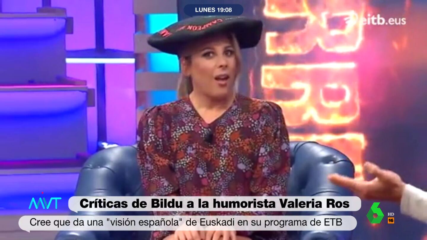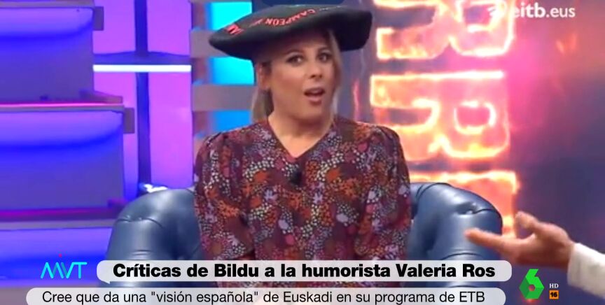 La humorista Valeria Ros presenta el programa 'Akelarre' de la ETB. En redes sociales, la formación EH Bildu ha criticado la "visión española" de Euskadi que dicen que da Ros. Concretamente ha sido la diputada Jasone Agirre, que ve "doloroso", "inaceptable" e "inquietante" la "mirada" que ofrece el programa.