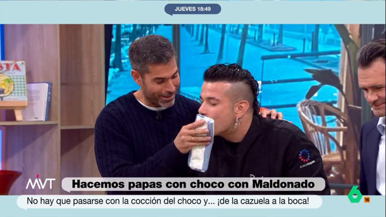 "¡Cuidado!", ha dicho Iñaki López, a lo que el chef lo confirma: "Me he manchado". "Para eso estamos", dice el presentador, que opina que esto da un "redoble de acción" al programa y, sobre todo, al cocinado de Maldonado.