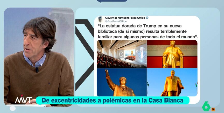 Gavin Newsom señala que una estatua así no es nada novedoso y que, además, tampoco es bueno para Estados Unidos. "¿Se ha comprobado que Donald Trump y Kim Jong-un no son la misma persona?", pregunta, irónico, Benjamín Prado. "Se intercambiaron cuando se cruzaron en el Paralelo 38", responde Pedro Rodríguez.