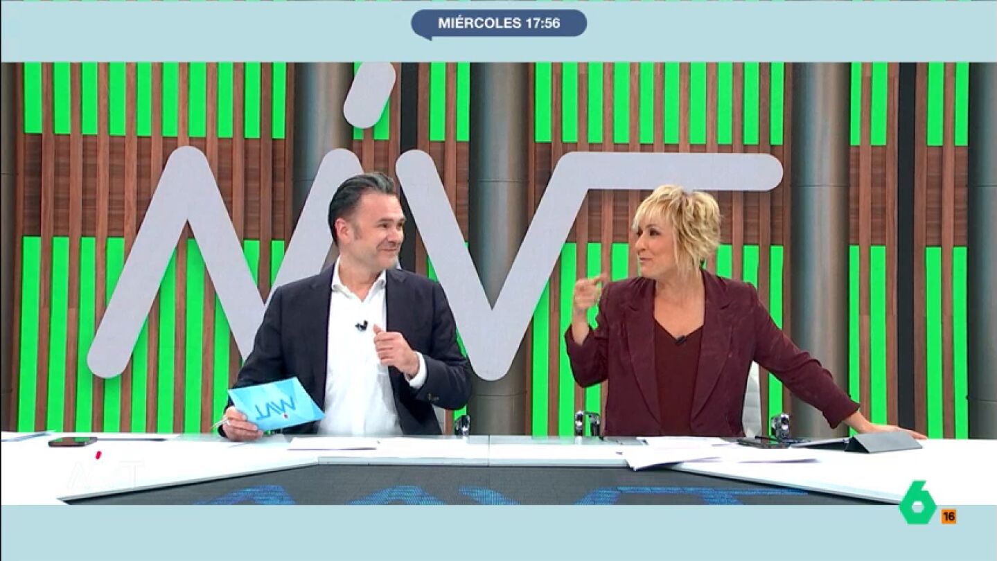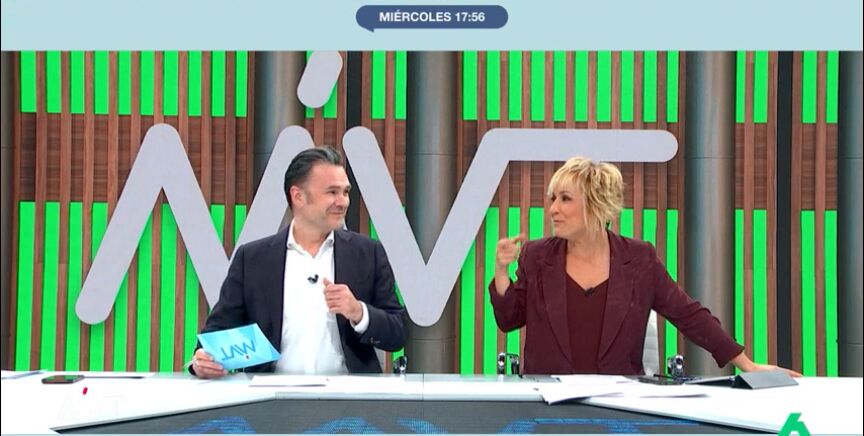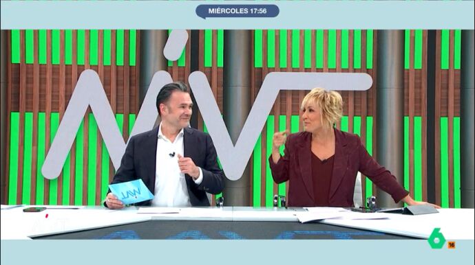 La presentadora de Más Vale Tarde estalla en risas ante el intento de Iñaki López de saludar por segunda vez en la tarde a los integrantes de la mesa de debate. Su reacción desata las carcajadas en plató.