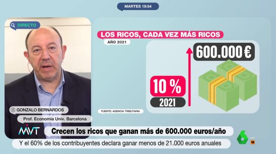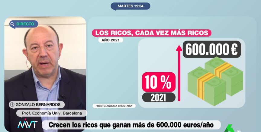 Los ultrarricos han crecido en 2021 un 10% pese a la pandemia, cuando el 60% de los españoles gana menos de 21.000 euros anuales. El economista Gonzalo Bernardos ha lanzado un dardo en Más Vale Tarde a los partidos políticos por la ausencia de un programa serio para las familias en precariedad desde hace 15 años. Sin embargo, ha señalado que él se "alegra que haya empresarios que se ganen muy bien la vida, siempre y cuando paguen buenos salarios".