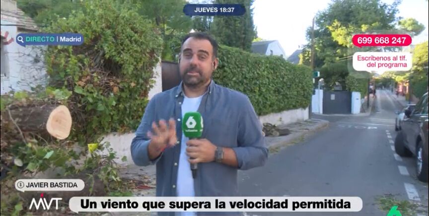 El reportero muestra como un árbol de unos 20 metros ha caído por culpa de las fuertes rachas de viento que han llegado a superar los 50 kilómetros por hora. "Afortunadamente no ha habido daños personales pero sí que se han tenido que retirar dos vehículos", explica Bastida.