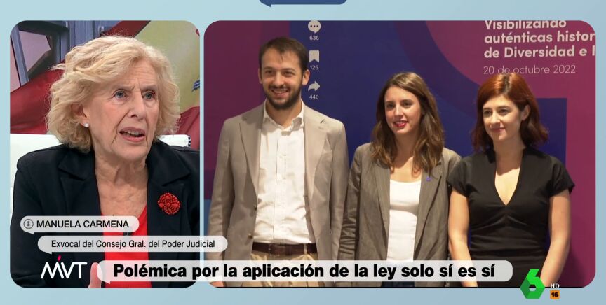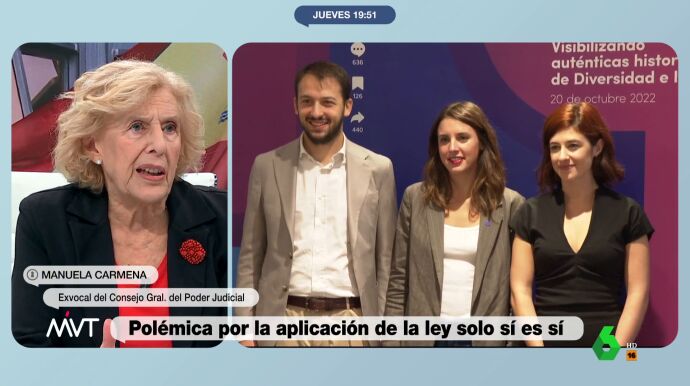 Manuela Carmena, exalcaldesa de Madrid y jueza, se ha pronunciado en Más Vale Tarde sobre la ley del 'sólo sí es sí' y su polémica aplicación, con más de un centenar de agresores sexuales beneficiados por la norma. "Si el objetivo era aumentar la penabilidad, no ha ido bien", ha considerado.