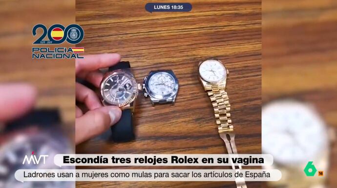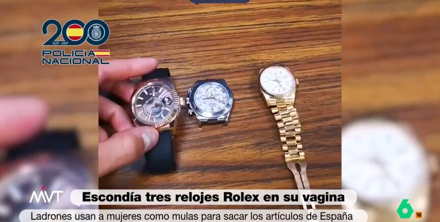 Una mujer ha sido detenida en el Aeropuerto Adolfo Suárez-Madrid Barajas, cuando trataba de huir a Italia con tres Rolex en el interior de su vagina. Como ha explicado el periodista José Luis Torá, pertenecía a una banda criminal napolitana que envía a grupos reducidos de personas encargados de sustraer relojes de alta gama a turistas y posteriormente regresar a Italia para venderlos. Esta operación se ha producido en conjunto entre la Policía Nacional, la Guardia Civil y la policía italiana.