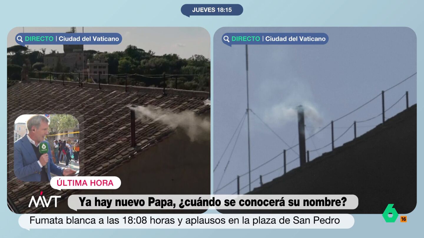 Mientras el periodista contaba esto a Iñaki López, que lo escuchaba atento desde el plató, una señora se ha cruzado con el periodista y, sin darse cuenta de que estaba en directo, ha preguntado quién es el nuevo papa. "Como si aquí tuviéramos hilo directo con el espíritu santo...", añade el corresponsal.