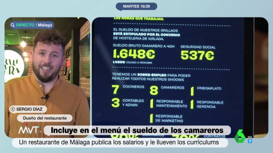 Una hamburguesería en Málaga ha decidido informar a sus clientes de las condiciones laborales de su personal, así como de sus sueldos. De este modo, junto a su carta digital, se puede encontrar esta información. Sergio Díaz, propietario del restaurante, ha contado en Más Vale Tarde qué les llevó a tomar esta decisión.