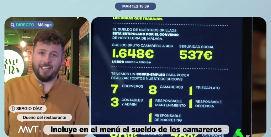 Sergio Díaz es el propietario de 'Grillaera Burger', un restaurante de Málaga que ha querido mostrar a todos sus clientes los salarios y las condiciones laborales de sus camareros con el fin de reivindicar los salarios dignos en la hostelería. Lo explica en Más Vale Tarde.