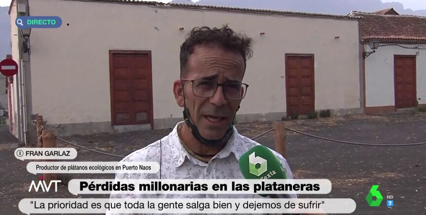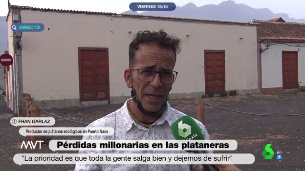 Fran Garlaz, dueño de una plantación de plátanos ecológicos en Puerto Naos, ha hecho un alegato en Más Vale Tarde destacando la "generosidad" de las personas ante una situación tan complicada como la que se vive en La Palma. "El volcán además de rocas y desgracias, expulsa amor y generosidad. La forma en la que todo el mundo te acoge y te pregunta si necesitas algo, y cómo se comparten las cosas es algo mágico", ha expresado.