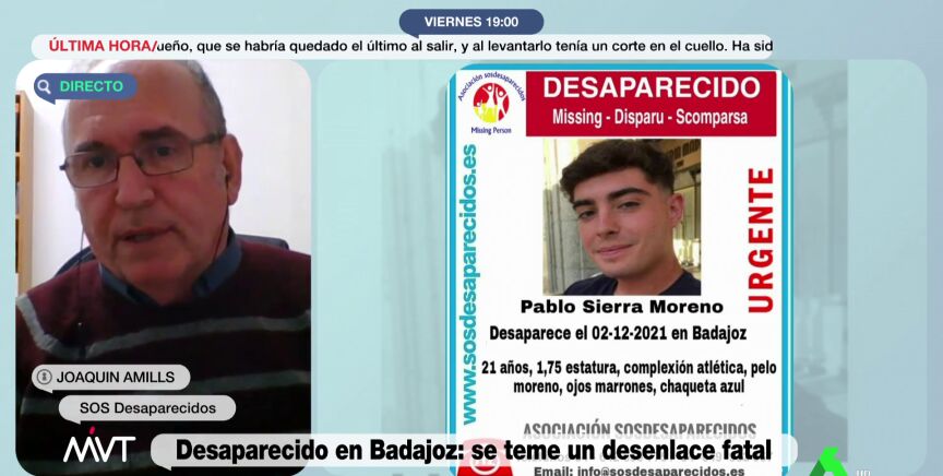 La familia de Pablo Sierra, el joven de 21 años desaparecido desde el pasado 3 de diciembre en Badajoz, está "rota", pero confiada en el trabajo que está realizando la Policía Nacional para dar con el paradero del estudiante. Así lo ha expresado Joaquín Amils, portavoz de la familia y creador de 'SOS Desaparecidos', en una entrevista con Más Vale Tarde.