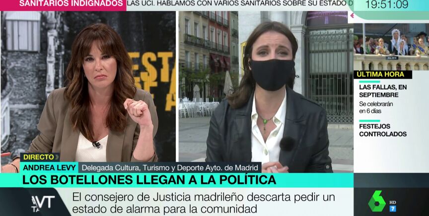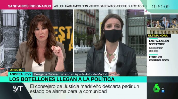 ¿Quiere Andrea Levy que vuelva el toque de queda? Es la pregunta que Mamen Mendizábal ha lanzado en Más Vale Tarde a la delegada de Cultura, Turismo y Deporte de Madrid, que no ha dado una respuesta clara sobre su posición al respecto. "En estos momentos que se ha levantado el estado de alarma no veo necesario que el conjunto de la población tenga que tener medidas restrictivas a su movilidad, ya que el estado de alarma es una medida excepcional", ha apuntado, lanzando un dardo al Gobierno: "No se puede gobernar en la excepcionalidad durante 14 meses sin adoptar ninguna medida alternativa".