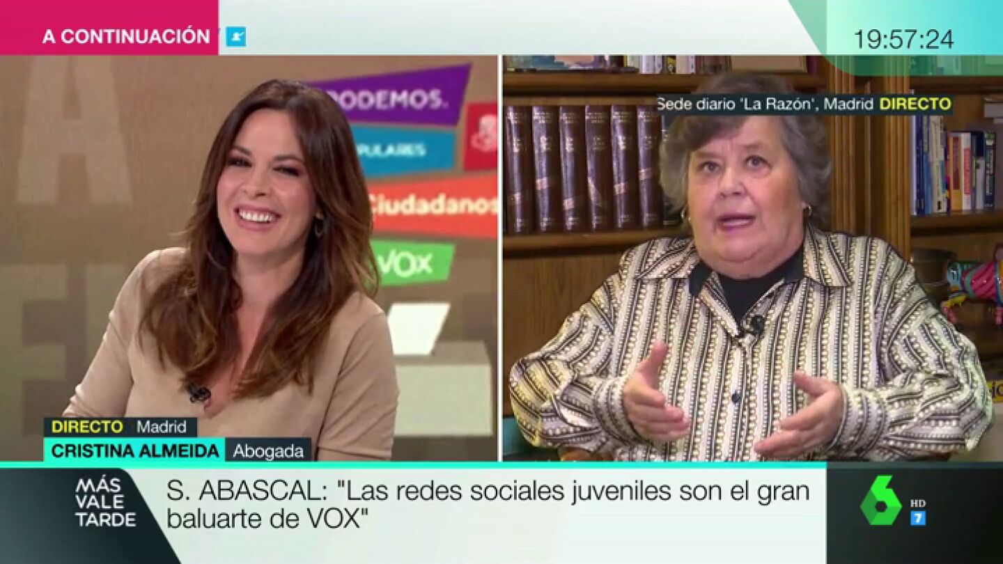 Respecto a que Vox haya comenzado la campaña pidiendo el voto contra las feministas y los separatistas, Cristina Almeida asegura que "tienen un absoluto desprecio a la democracia y se inventan que son los españoles de verdad". Y en realidad, dice, "están luchando por una España sin libertades, sin autonomía, sin nada de lo que dice la Constitución".