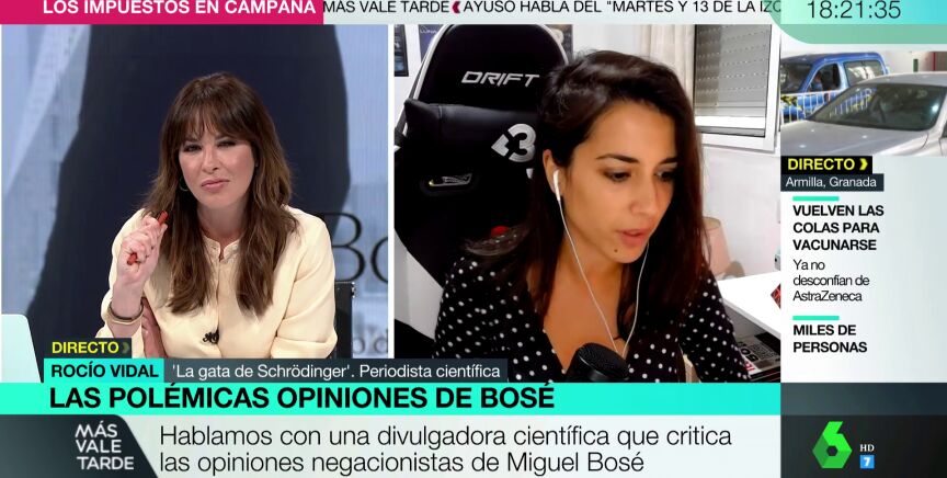 Rocío Vidal, conocida en redes sociales como 'la gata de Schrödinger', critica en Más Vale Tarde que Miguel Bosé se ponga como adalid del negacionismo al mismo tiempo que "se jacta de haberse metido de todo".