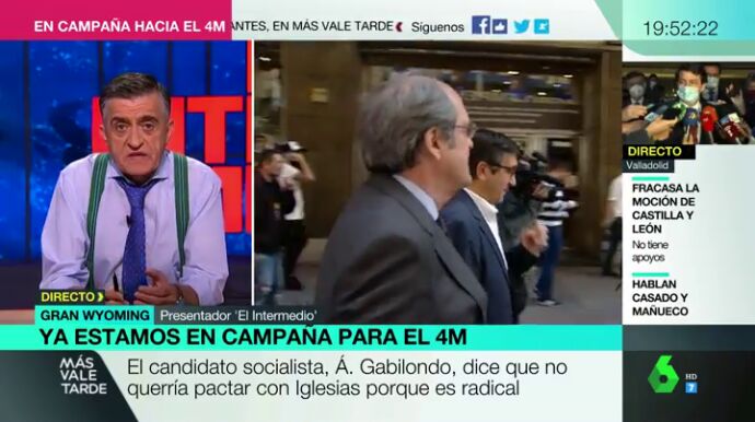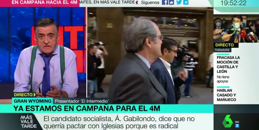 Para el Gran Wyoming, "poner a Podemos y a Vox en los extremos" es "muy injusto". Así se ha pronunciado el presentador en Más Vale Tarde a raíz del rechazo de Ángel Gabilondo a pactar con Pablo Iglesias en la Comunidad de Madrid por su "planteamiento extremista y radical".