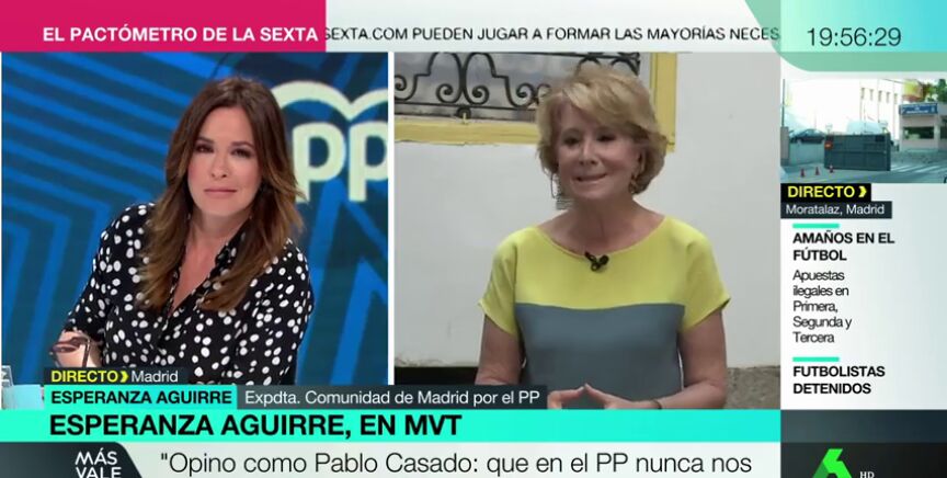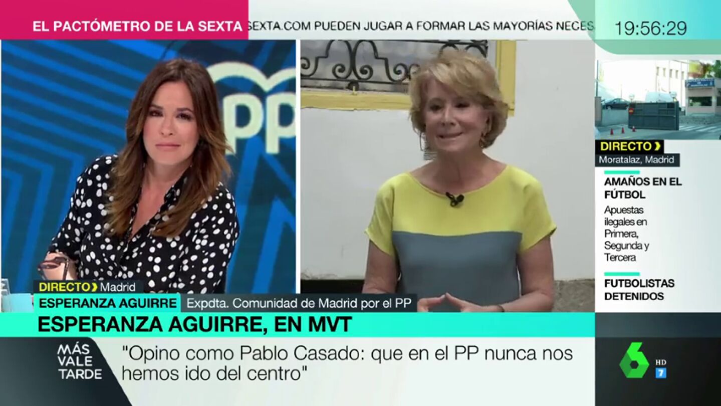 Aguirre también ha aprovechado la entrevista para reconocer que, a pesar de que nunca ha dejado la política (solo "la primera fila"), su vocación es "ser tertuliana". "Aquí me tienes", le ha dicho la expresidenta a la presentadora del programa, haciendo una especie de ofrecimiento a colaborar en MVT.