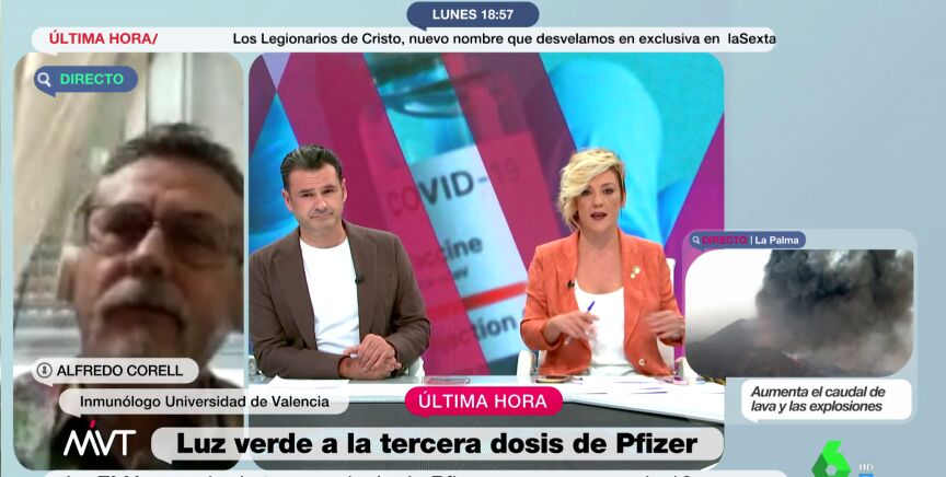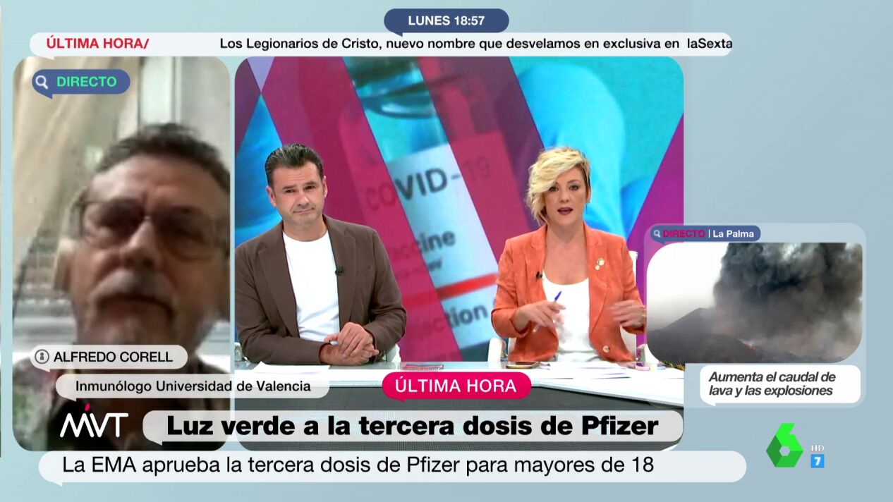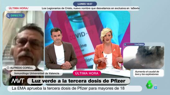 La EMA ha aprobado la aplicación de una tercera dosis de la vacuna de Pfizeren toda la población mayor de 18 años. Una noticia que el inmunólogo Alfredo Corell ha querido analizar al detalle: "En la nota de prensa hay que distinguir la parte en la que se asegura que hay que poner la tercera dosis a los inmunodeprimidos severos y levantan la mano para que se pueda poner la tercera dosis en todas las personas sanas, pero no dicen que haya que ponerla".
