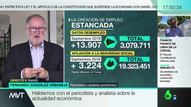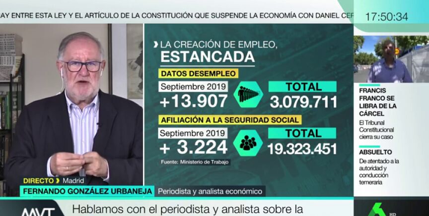 Fernando González Urbaneja, periodista y analista económico, explica que estos datos sobre el empleo hay que "cogerlos con pinzas" porque septiembre es un mes de ajustes: se va el empleo del turismo de verano y llega el empleo de la precariedad de sanidad y educación.