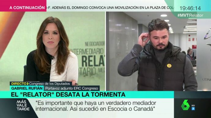 Gabriel Rufián, interviene en el programa para explicar su opinión sobre la decisión del Gobierno de permitir un "relator" en las negociaciones con el gobierno catalán. "Nosotros pedimos una mesa de negociación que aglutine ambos gobiernos, en la que estén otros los partidos y un mediador, internacional a poder ser, porque es lo más imparcial posible".