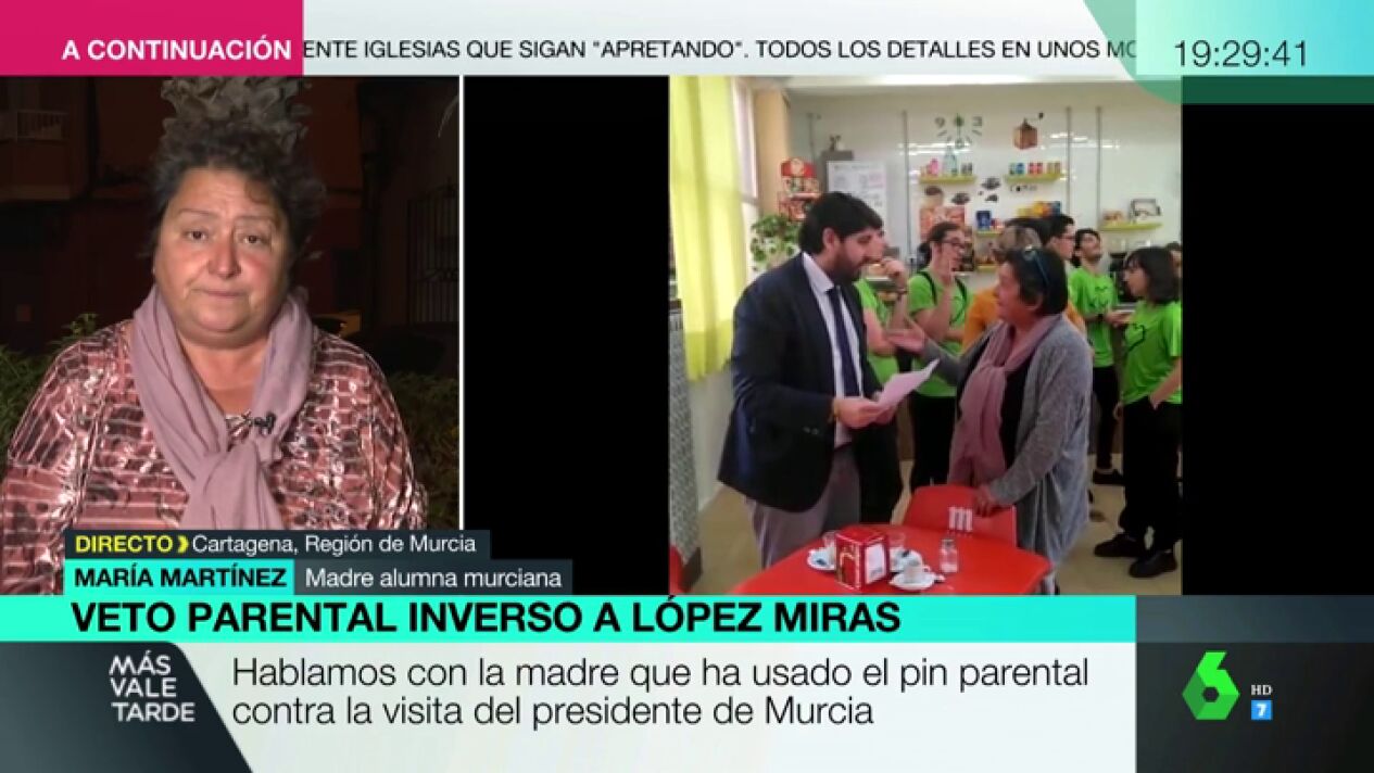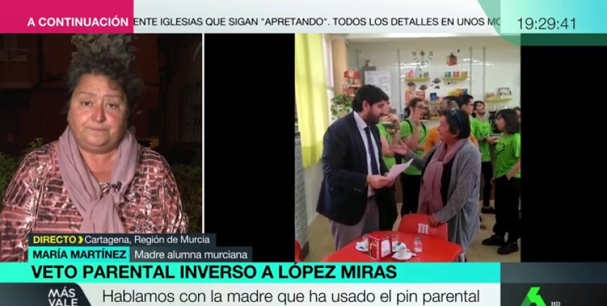 María Martínez utilizó el veto parental que se aplica en la región de Murcia para impedir que su hija asistiera a una charla del presidente, López Miras, en su instituto. Para mostrarle los motivos le entregó una carta en mano y le negó "sentarse a negociar": "Cuando le di la carta no aceptó que hubiera prensa".