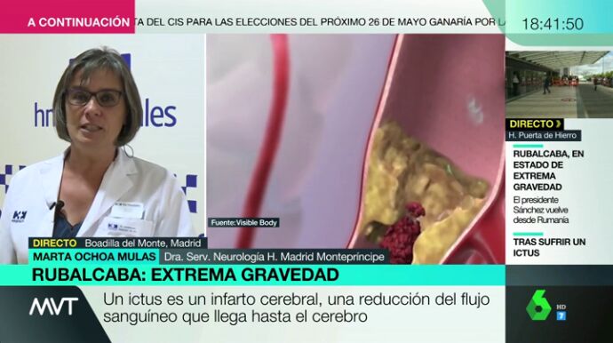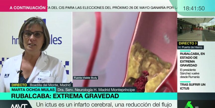 Marta Ochoa, doctora en el servicio de Neurología de Hospital Montepríncipe de Madrid, explica que "un ictus pueden ser dos cosas: o no me llega sangre al cerebro o se me rompe una arteria y tengo una hemorragia". "Es una urgencia médica, y hay que enseñar cómo actuar ante estos casos", incide la doctora.