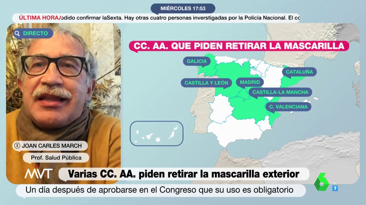 El experto en Salud Pública Joan Carles March ha sido muy crítico con la medida del Gobierno de forzar el uso de la mascarilla en exteriores para limitar los contagios de la variante ómicron del COVID-19.
