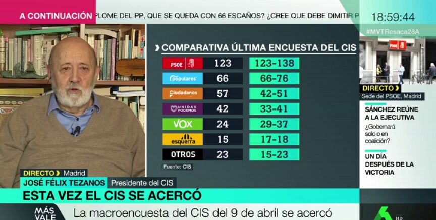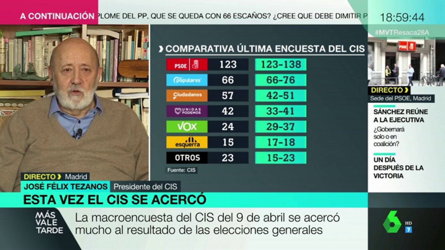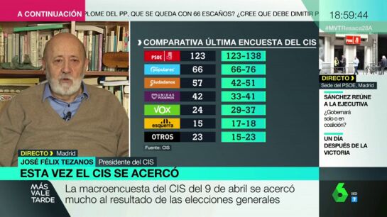 El presidente del CIS, José Félix Tezanos, analiza en MVT los resultados del 28A: "Que el PP tenga una bajada tan drástica, no deja de sorprender".