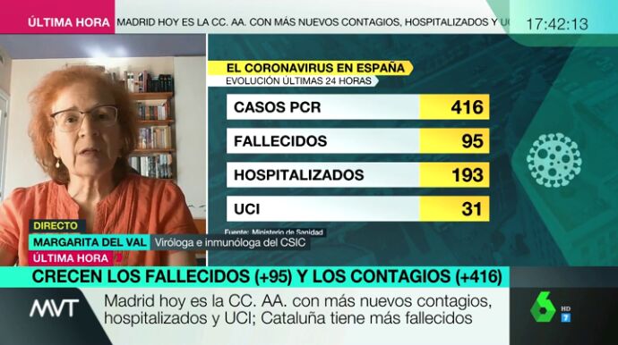 Margarita del Val, viróloga e inmunóloga del CSIC, ha reconocido que estamos en una etapa "estable", pero hay que tomarla con cautela de cara a la desescalada: "Hay mucho virus suelto, mucho más que cuando se inició el estado de alarma"