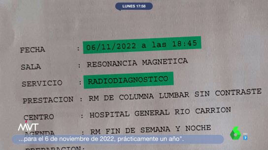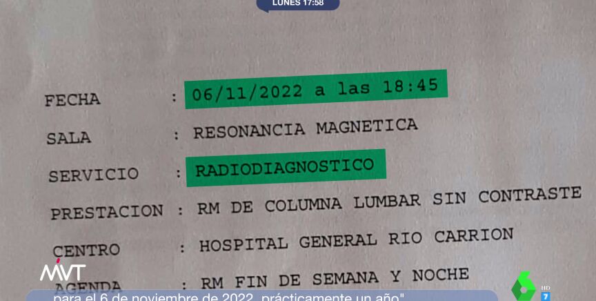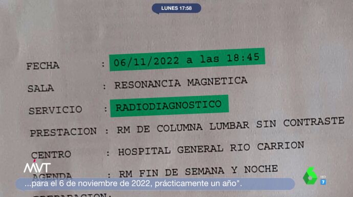 Raquel, una mujer de 54 años con dolores crónicos de espalda, explica su situación a laSexta tras recibir la próxima cita para el 6 de noviembre de 2022: "Yo no quiero que a mí me adelante la consulta, quiero que a todos nos la adelanten".