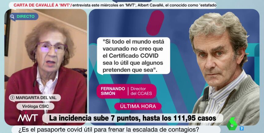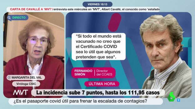 Preguntada por la utilidad del pasaporte COVID, Del Val insiste en que todo pasa por la vacunación, advirtiendo de las secuelas post-COVID que pueden sufrir a largo plazo. "Algunos de ellos, por no vacunarse, van a tener achaques de viejos desde jóvenes", afirma.