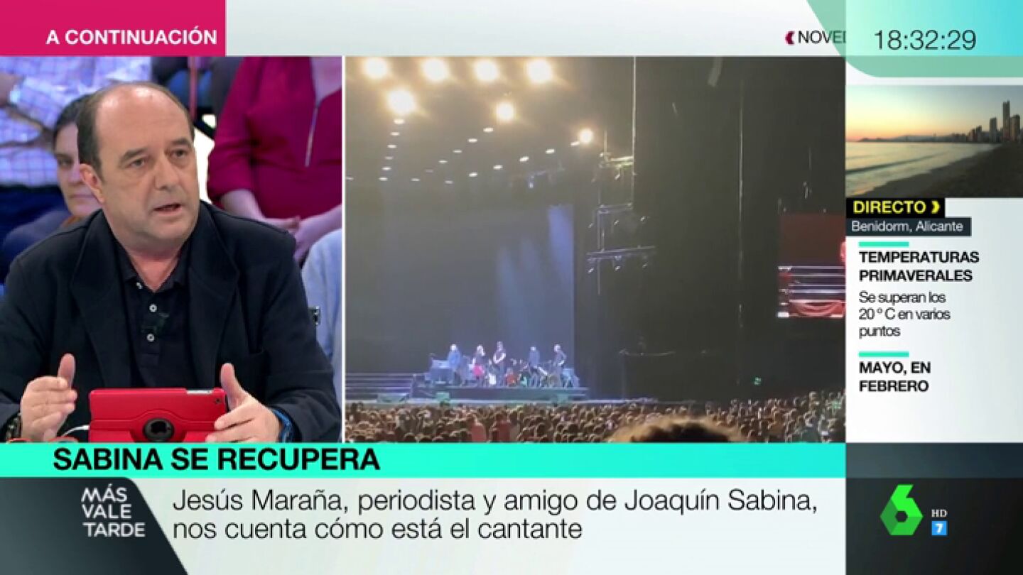 Joaquín Sabina se recupera de forma favorable. El cantante tuvo que ser intervenido de un hematoma intracraneal tras caerse del escenario durante un concierto en Madrid. Jesús Maraña, periodista y amigo de Sabina, cuenta en MVT cómo se encuentra el artista.