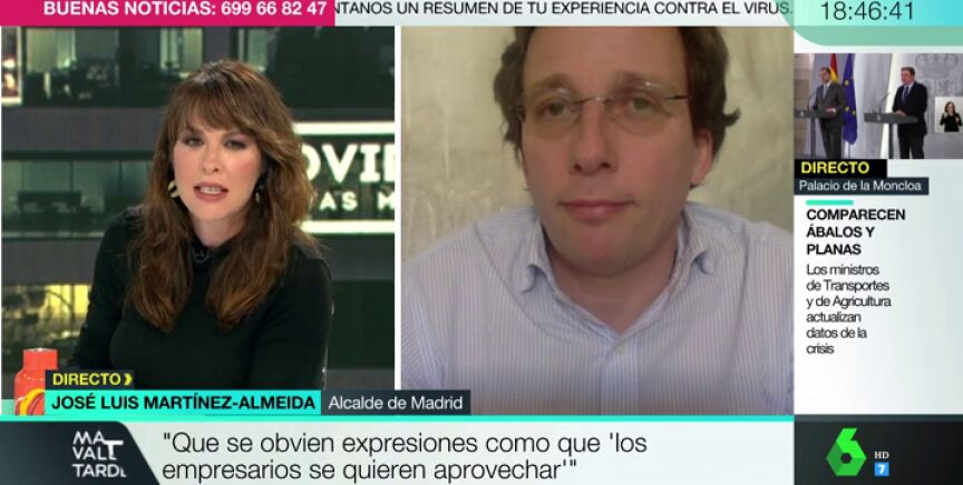 Mamen Mendizábal entrevista en Más Vale Tarde al alcalde de Madrid, José Luis Martínez-Almeida, quien destaca la importancia en llegar ya al pico de contagios por coronavirus: "A ver cuándo llega el maldito pico de una vez y se aplana la curva".