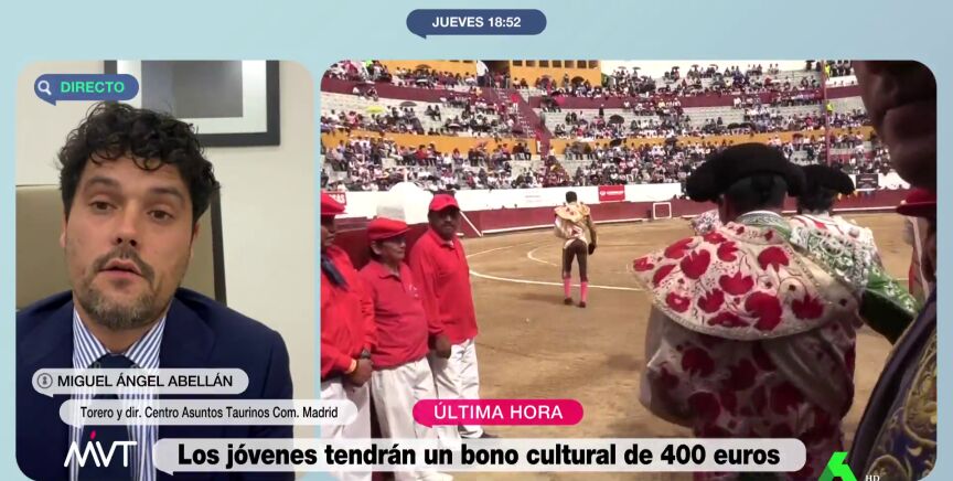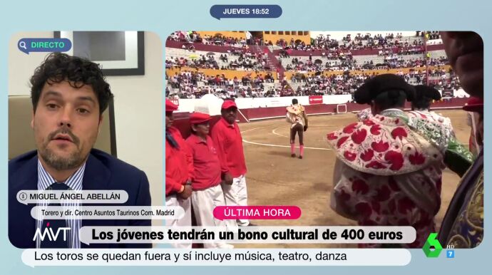 El bono cultural para jóvenes anunciado por el Gobierno de Pedro Sánchez finalmente no incluirá la tauromaquia. Una noticia que el torero Miguel Abellán, director del Centro de Asuntos Taurinos de la Comunidad de Madrid, ha criticado en Más Vale Tarde.