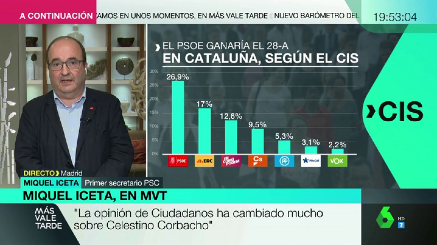 El último barómetro del CIS otorga uno de cada tres voto para el PSOE, tal y como recuerda Mamen Mendizábal a Miquel Iceta, primer secretario del PSC. "No creo que el CIS manipule", asegura el político que celebra que la "tendencia sea favorable" para su formación.